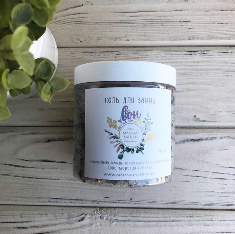 Сакская соль для ванны с композицией эфирных масел лаванды, шалфея мускатного, можжевельника. Данная композиция оказывает успокаивающее и физически раслабляющее действие, помогает снять напряжение в мышцах.